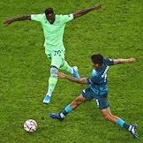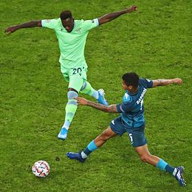 Лига чемпионов УЕФА по футболу. 3 тур. Матч между командами "Зенит" (Россия, Санкт-Петербург) и "Лацио" (Рим, Италия) на стадионе "Газпром Арена". Игрок команды "Зенит" Далер Кузяев (слева) и игрок команды "Лацио" Ведат Мурики (справа) во время матча.