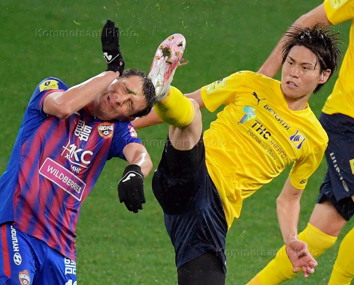 Российская Премьер-Лига (РПЛ). Тинькофф - Чемпионат России по футболу 2020/2021. 14-й тур. Матч между командами ЦСКА (Москва) и "Ростов" (Ростов-на-Дону) на стадионе "ВЭБ Арена". Игрок ПФК ЦСКА Алан Дзагоев (слева) и игрок ФК "Ростов" Кэнто Хасимото во время матча.