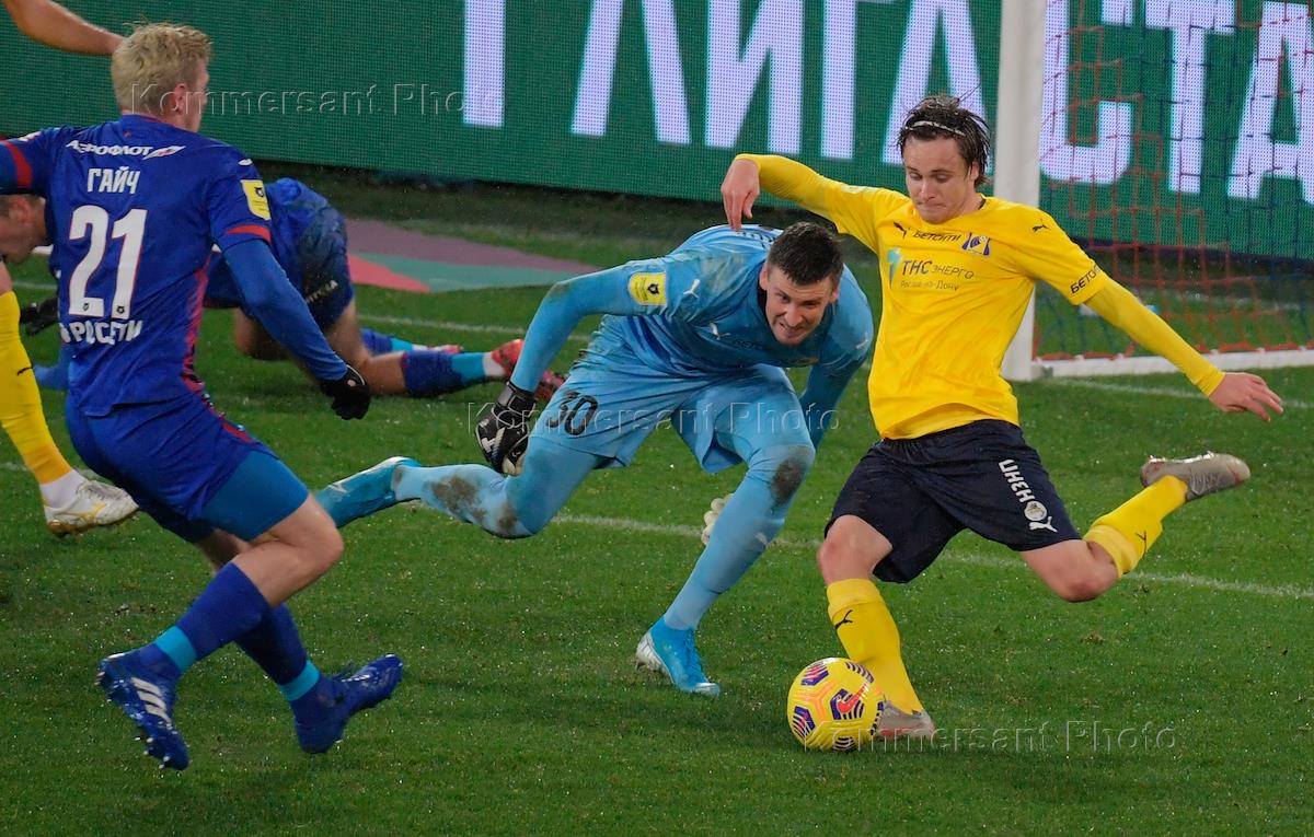 Российская Премьер-Лига (РПЛ). Тинькофф - Чемпионат России по футболу 2020/2021. 14-й тур. Матч между командами ЦСКА (Москва) и "Ростов" (Ростов-на-Дону) на стадионе "ВЭБ Арена". Игрок команды "Ростов" Понтус Альмквист (справа) и вратарь команды ЦСКА Игорь Акинфеев(слева) во время матча.