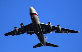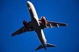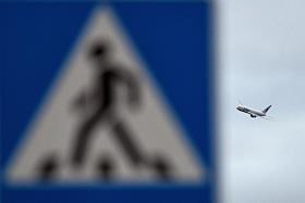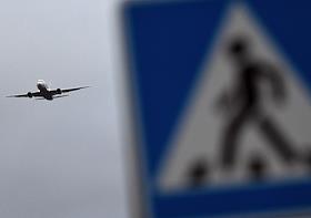 Самолеты в Международном аэропорту Внуково имени А.Н. Туполева. Жанровые фотографии. Дорожный знак "Наземный пешеходный переход" и летящий самолет авиакомпании Utair ("ЮТэйр").