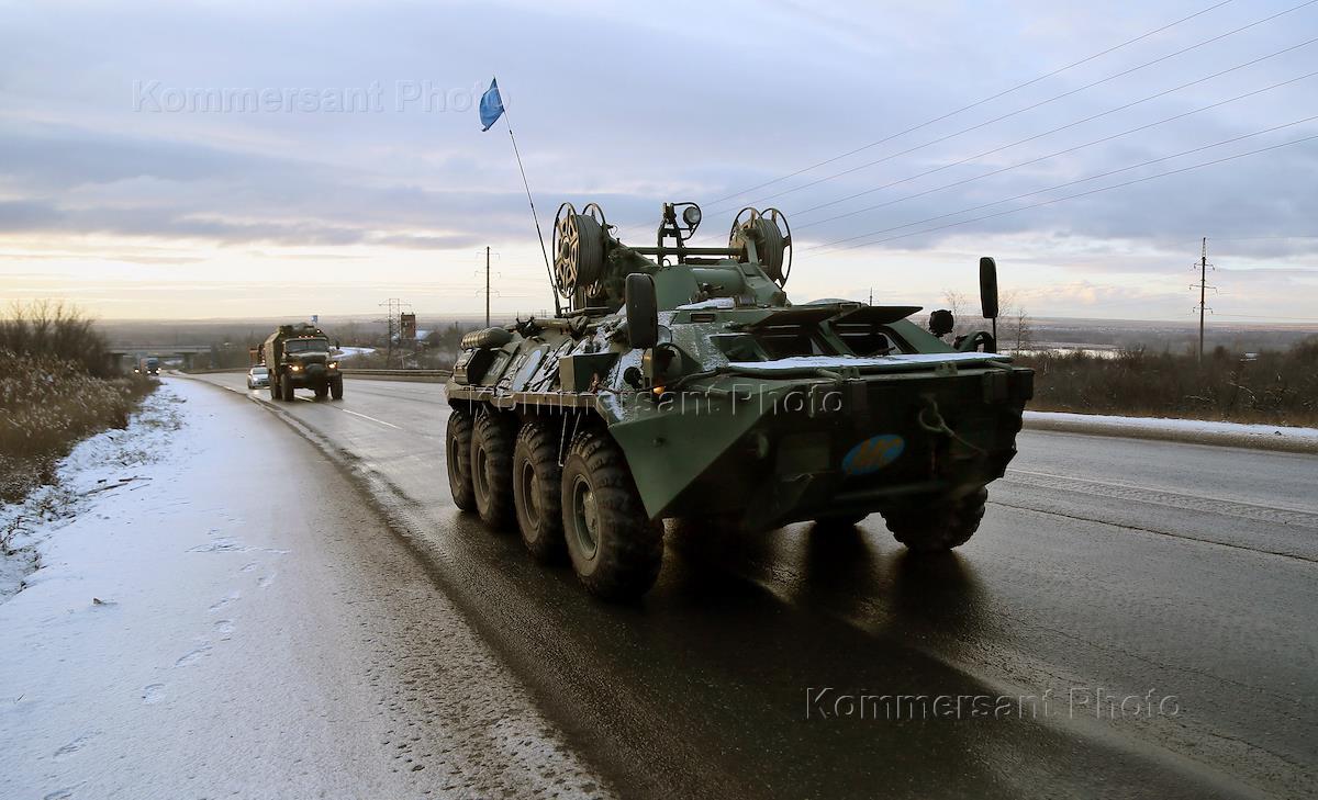 Колонна российских миротворцев, направляющихся в Нагорный Карабах, на трассе в Самарской области.