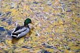 Виды Москвы. Жанровая фотография. Утка в водоеме среди опавших листьев.