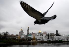 Виды Москвы. Жанровая фотография. Голубь на фоне куполов Богородице-Смоленского Новодевичьего женского монастыря.