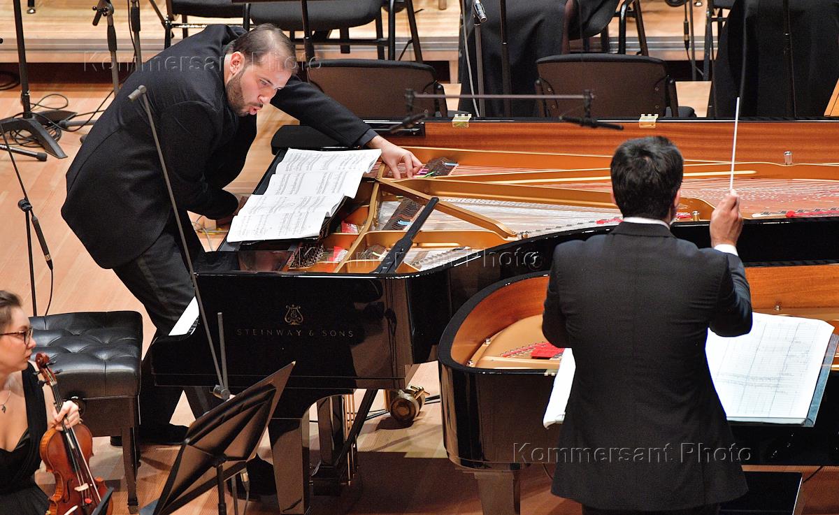 VII Международный фестиваль актуальной музыки "Другое пространство" в концертном зале имени П.И.Чайковского. Пианист Станислав Христенко (слева) и дирижер Валентин Урюпин (справа) во время концерта Российского национального молодежного симфонического оркестра (РНМСО).