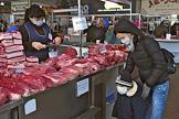 Городская жизнь в условиях распространения коронавирусной инфекции COVID-19. Жанровая фотография. Продавщица мяса и покупательница в медицинских масках на рынке.