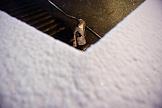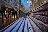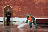 Views of Moscow during a snowfall. Alexander Garden. Genre photography. A municipal service employee sprinkles deicing agents at the Tomb of the Unknown Soldier Memorial.