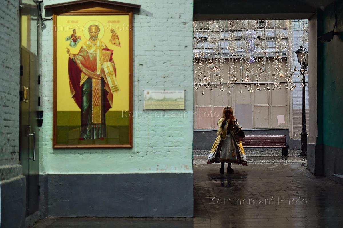 Moscow views during a snowfall. Nikolskaya street. Genre photography.