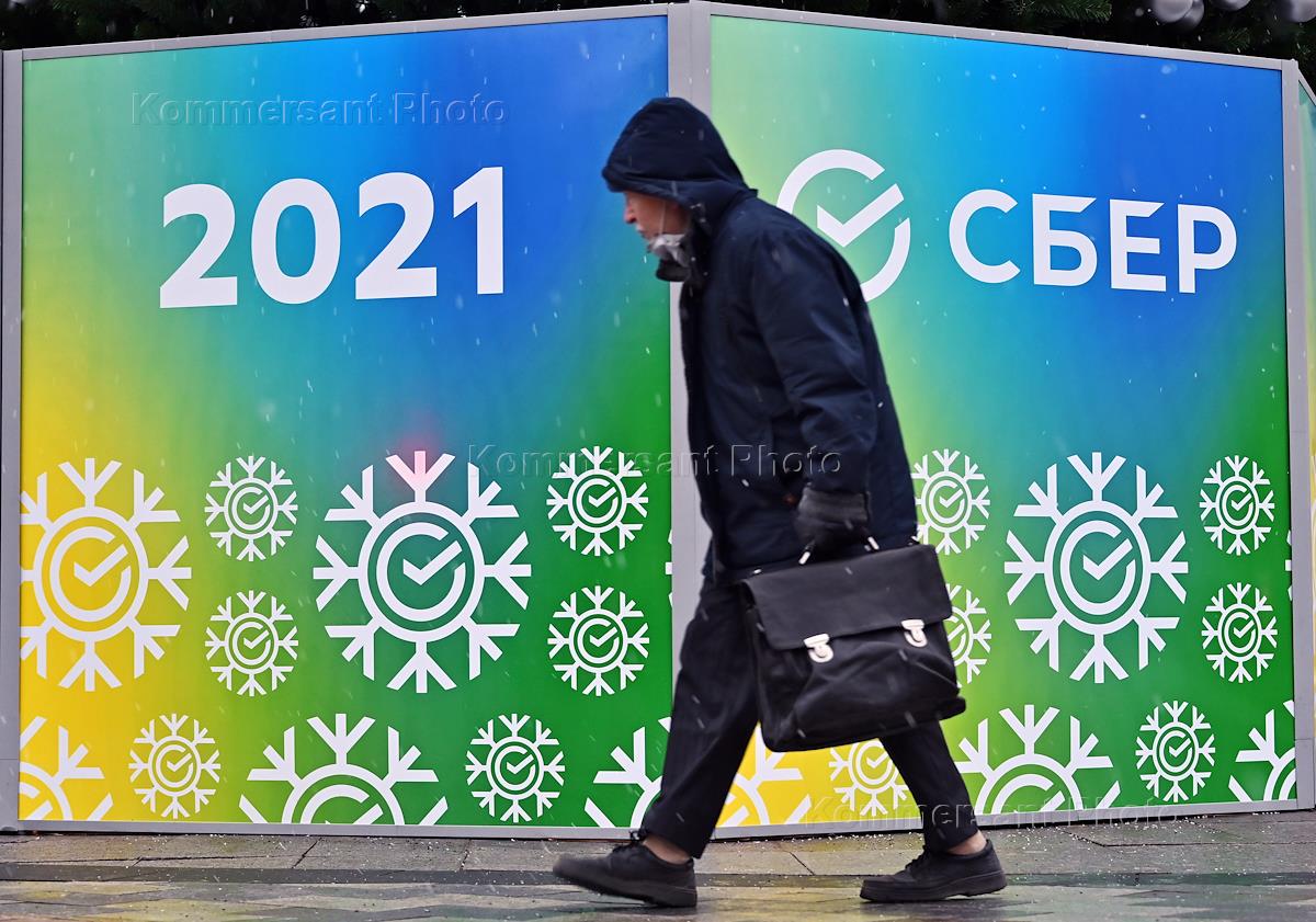 Виды Москвы. Жанровая фотография. Городская жизнь в условиях распространения коронавирусной инфекции COVID-19. Новогодняя елка с рекламой Сбер банка у Многофункционального комплекса "Оружейный".