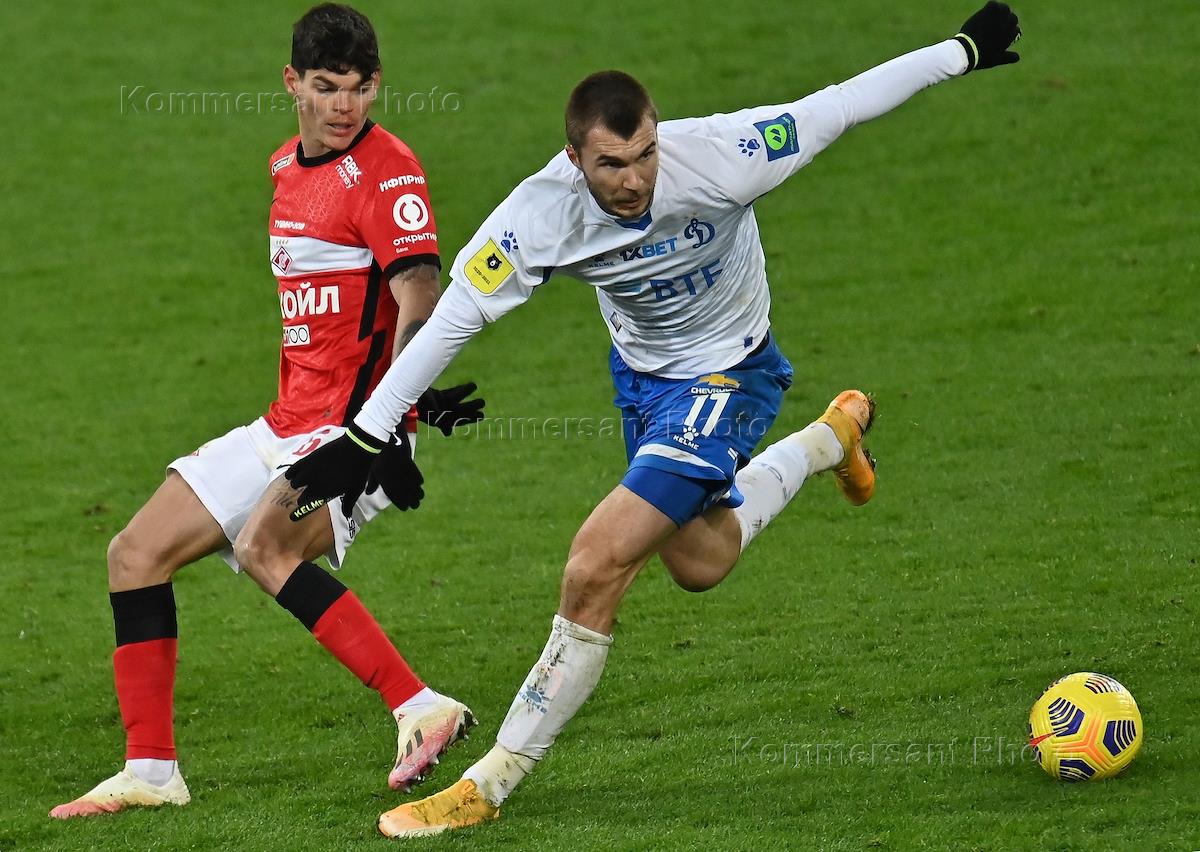Российская Премьер-Лига (РПЛ). Тинькофф - Чемпионат России по футболу 2020/2021. 15-й тур. Матч между командами "Спартак" (Москва) - "Динамо" (Москва) на стадионе "Открытие Арена". Игрок команды "Динамо" Николай Комличенко (справа) во время матча.