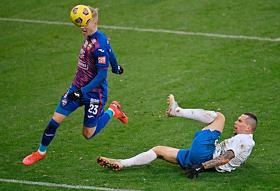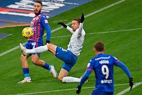 Российская Премьер-Лига (РПЛ). Тинькофф - Чемпионат России по футболу 2020/2021. 15-й тур. Матч между командами ФК ЦСКА (Москва) - "Сочи" (Сочи) на стадионе "ВЭБ Арена". Игрок команды ЦСКА Игорь Дивеев (слева) и игрок команды "Сочи" Антон Заболотный (справа) во время матча.