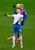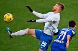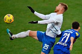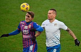 Российская Премьер-Лига (РПЛ). Тинькофф - Чемпионат России по футболу 2020/2021. 15-й тур. Матч между командами ФК ЦСКА (Москва) - "Сочи" (Сочи) на стадионе "ВЭБ Арена". Игрок команды "Сочи" Антон Заболотный (справа) и игрок команды ЦСКА Хёрдур Магнуссон (слева) во время матча.