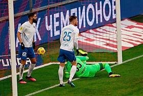Российская Премьер-Лига (РПЛ). Тинькофф - Чемпионат России по футболу 2020/2021. 15-й тур. Матч между командами ЦСКА (Москва) - "Сочи" (Сочи) на стадионе "ВЭБ Арена". Слева направо: игроки команды "Сочи" Миха Мевля, Иван Новосельцев и Сослан Джанаев (вратарь) во время матча.