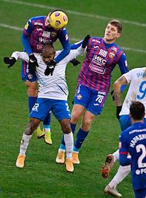 Российская Премьер-Лига (РПЛ). Тинькофф - Чемпионат России по футболу 2020/2021. 15-й тур. Матч между командами ЦСКА (Москва) - "Сочи" (Сочи) на стадионе "ВЭБ Арена". Игрок команды ЦСКА Хёрдур Магнуссон(слева) и игрок команды "Сочи" Антон Заболотный (слева) во время матча.