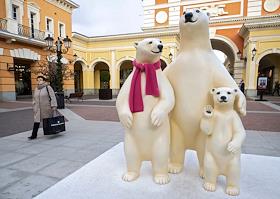 Меры предосторожности из-за опасности распространения коронавирусной инфекции COVOD-19. Магазины на территории Outlet Village Пулково во время "масочного режима". Жанровая фотография. Скульптурная композиция "Семья белых медведей".