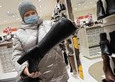 Меры предосторожности из-за опасности распространения коронавирусной инфекции COVOD-19. Магазины на территории Outlet Village Пулково во время "масочного режима". Жанровая фотография. ПОкупательница в медицинской маске в обувном магизне.