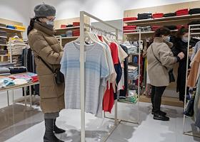Меры предосторожности из-за опасности распространения коронавирусной инфекции COVOD-19. Магазины на территории Outlet Village Пулково во время "масочного режима". Жанровая фотография. Покупательницы в медицинских масках в магазине одежды.
