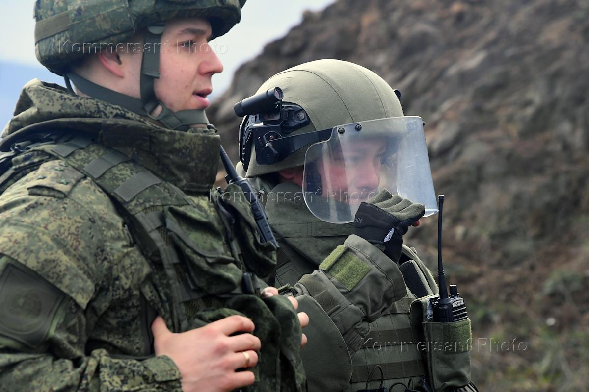 The political situation in Nagorno-Karabakh. Servicemen of the Russian peacekeeping forces on an armored vehicle on the road.