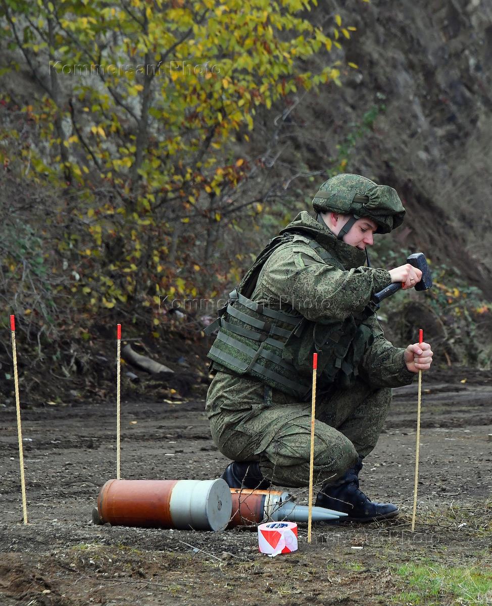 The political situation in Nagorno-Karabakh. Servicemen-sappers of the Russian peacekeeping forces during demining of a roadside area near the city of Shusha.