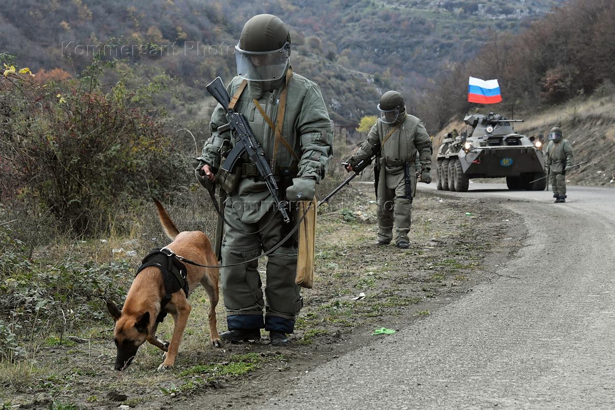 Политическая ситуация в Нагорном Карабахе. Военнослужащие-саперы российских миротворческих сил во время разминирования придорожной территории.