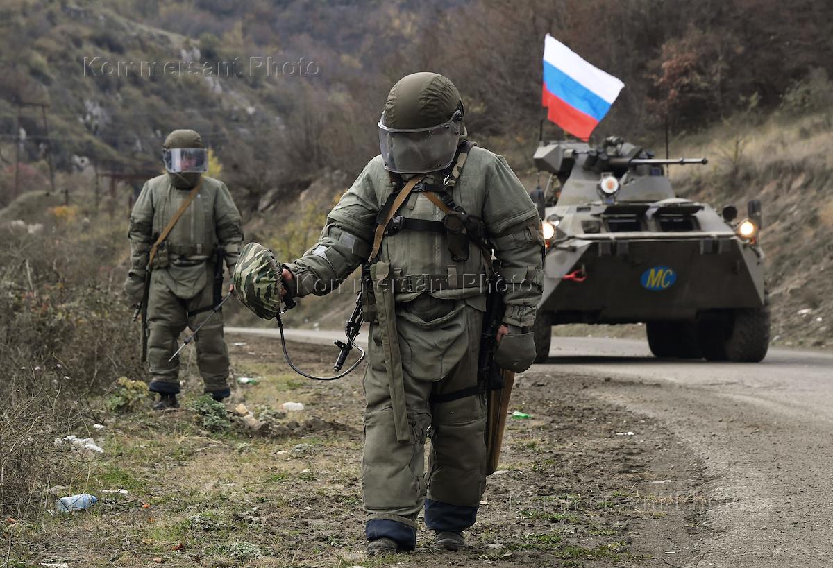 Политическая ситуация в Нагорном Карабахе. Военнослужащие миротворческих сил России на бронетранспортере на дороге.