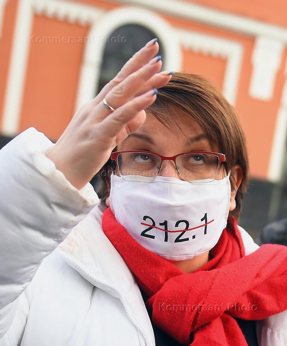 Участник одиночного пикет у здания Тверского районного суда, где проходит рассмотрение уголовного дела в отношении муниципального депутата Юлии Галяминой, обвиняемой в неоднократном нарушении порядка проведения митингов.