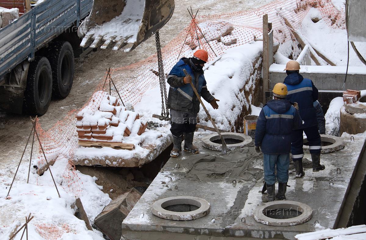 Жанровая фотография. Строители на стройплощадке заделывают цементом площадку для канализационных люков.