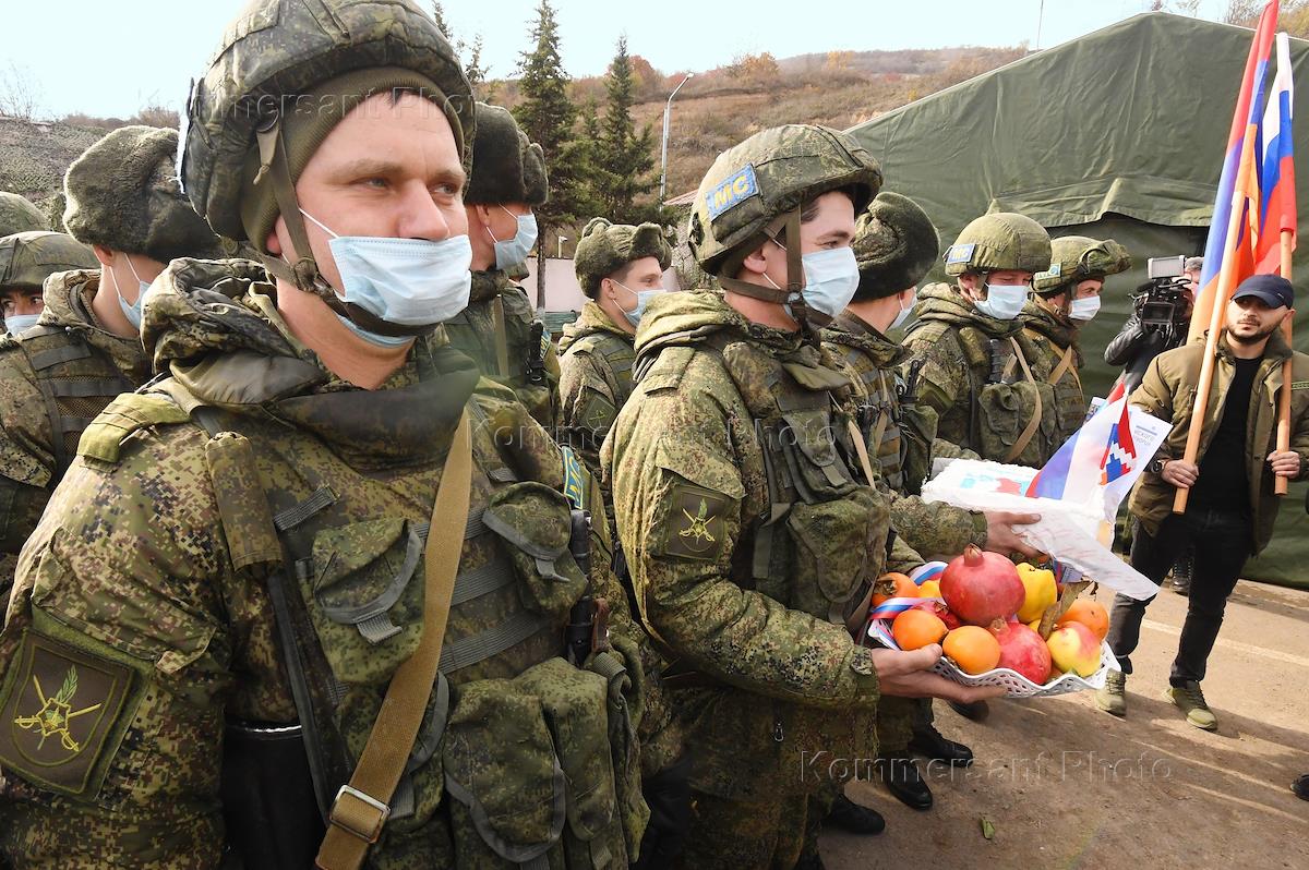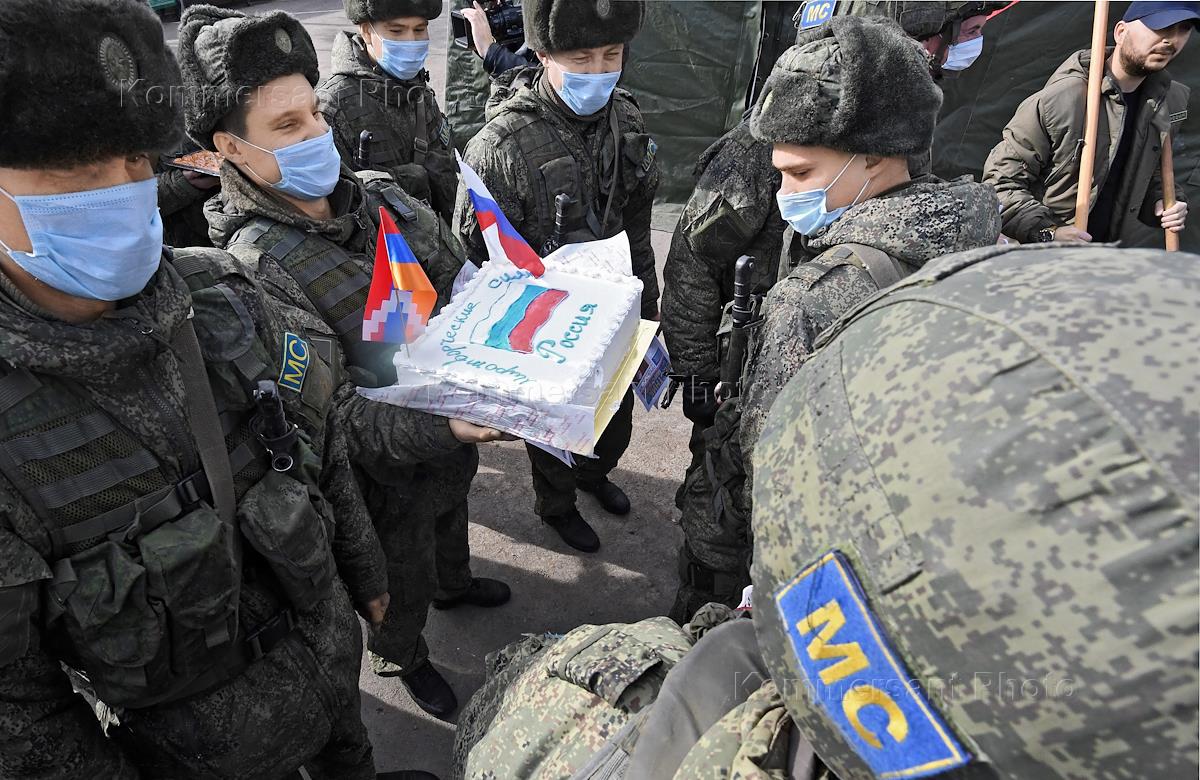 Политическая ситуация в Нагорном Карабахе. Праздничные мероприятия, приуроченные к так называемому Дню российского военного миротворца, когда 25 ноября 1973 года советских военные наблюдатели в составе миротворческих сил ООН прибыли в Египет для наблюдения за ситуацией в зоне Суэцкого канала и в районе Голанских высот. Военнослужащие миротворческого батальона 15-й отдельной мотострелковой бригады Центрального военного округа России и местный житель.