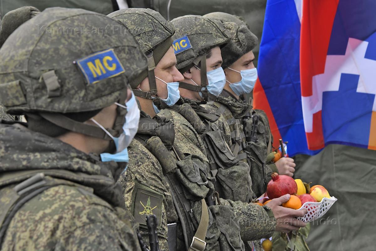 Политическая ситуация в Нагорном Карабахе. Праздничные мероприятия, приуроченные к так называемому Дню российского военного миротворца, когда 25 ноября 1973 года советских военные наблюдатели в составе миротворческих сил ООН прибыли в Египет для наблюдения за ситуацией в зоне Суэцкого канала и в районе Голанских высот. Военнослужащие миротворческого батальона 15-й отдельной мотострелковой бригады Центрального военного округа России и местный житель.
