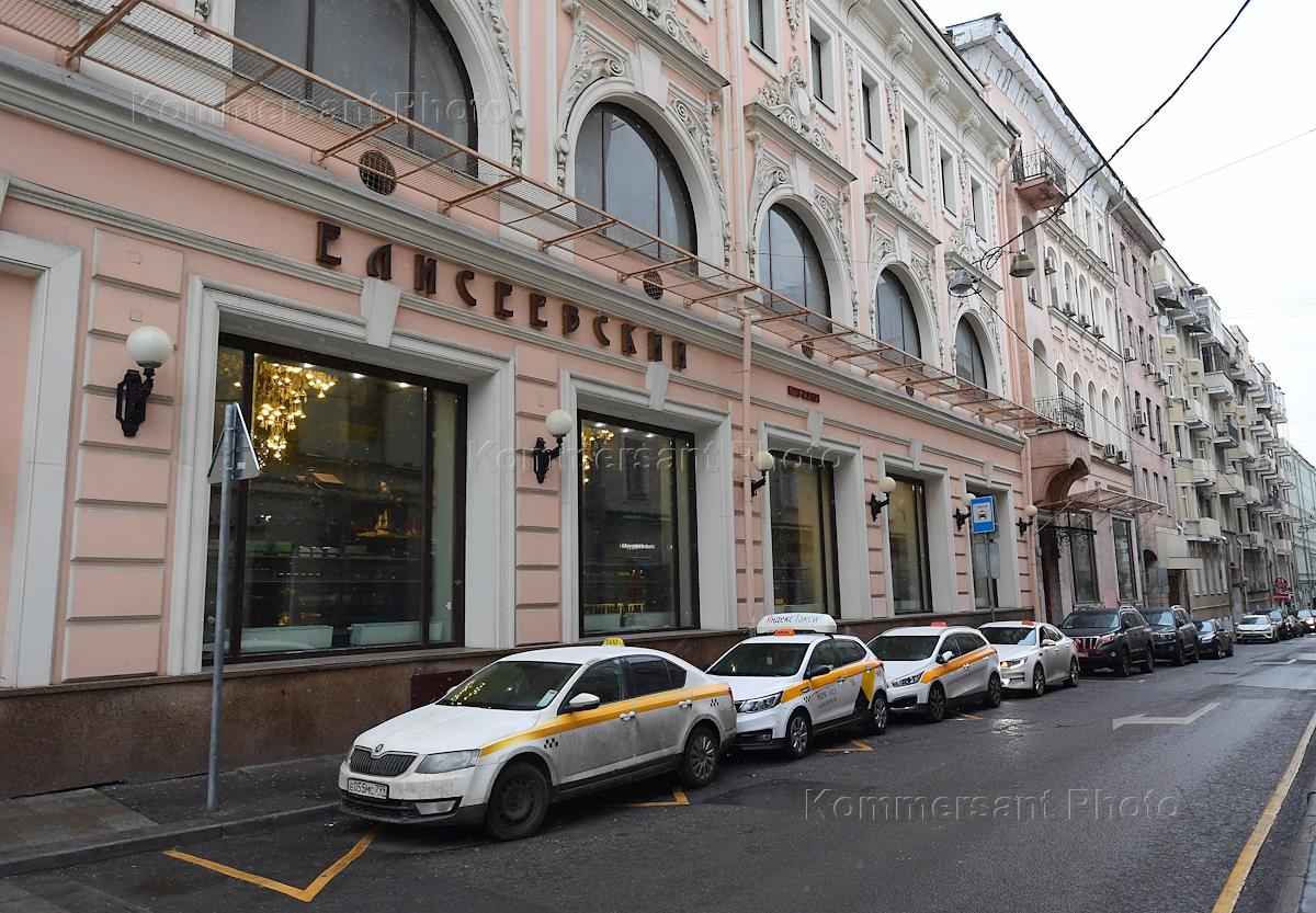 Виды Москвы. Елисеевский магазин на Тверской улице. Автомобили такси припаркованные у магазине со стороны Козицкого переулка.