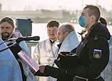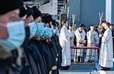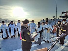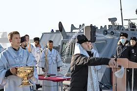 Церемония приема в корабельный состав Черноморского флота России нового патрульного корабля "Павел Державин" на Новороссийской военно-морской базе Черноморского флота России. Священнослужители во время церемонии.