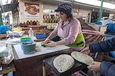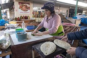 Политическая ситуация в Нагорном Карабахе. Виды Степанакерта. Жанровая фотография. Женщина на рынке готовит традиционный пирог (лепёшка с зеленью).