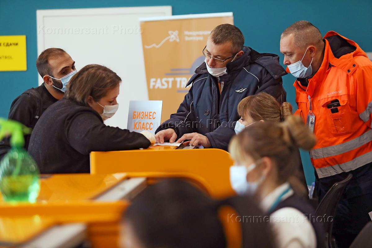 Работа аэропорта в период ограничений из-за угрозы распространения коронавирусной инфекции COVID-19. Жанровая фотография. Пассажиры у стойки регистрации на рейс.