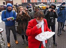 Рассмотрение уголовного дела в отношении муниципального депутата Юлии Галяминой, обвиняемой в неоднократном нарушении порядка проведения митингов, в Тверском районном суде. Муниципальный депутат Юлия Галямина (справа) с пирожками собственного изготовления после заседания суда.