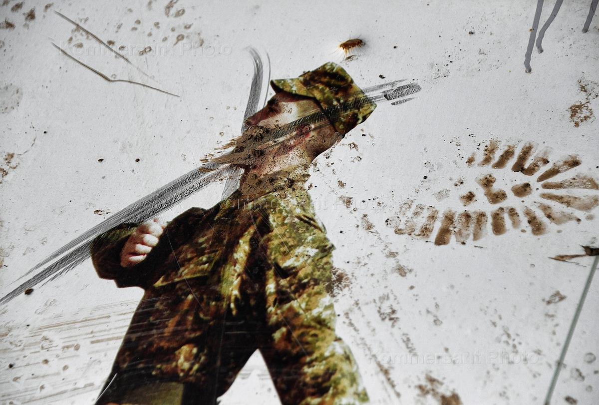 Азербайджан после завершения военного конфликта вокруг Нагорного Карабаха. Плакат с портретом каталикоса Армении на земле на территории военной части армянских сил, захваченной вооруженными силами Азербайджана в городе Физули.