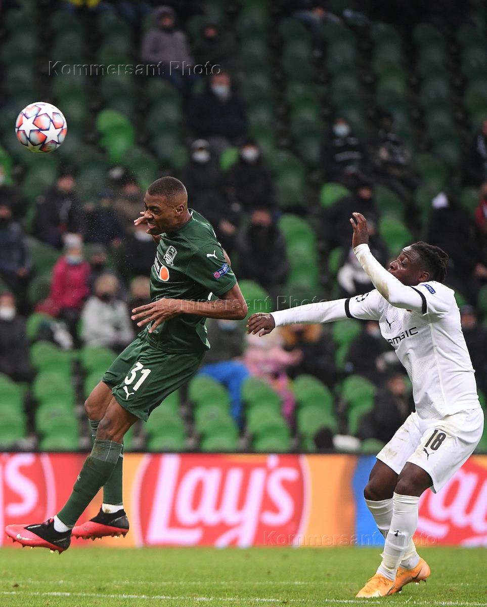 Лига чемпионов УЕФА. Матч по футболу между командами "Краснодар" (Краснодар, Россия) - "Ренн" (Ренн, Франция) на стадионе "Краснодар". Игрок команды "Ренн" Жереми Доку (слева) и игрок команды "Краснодар" Игорь Смольников (справа) во время матча.