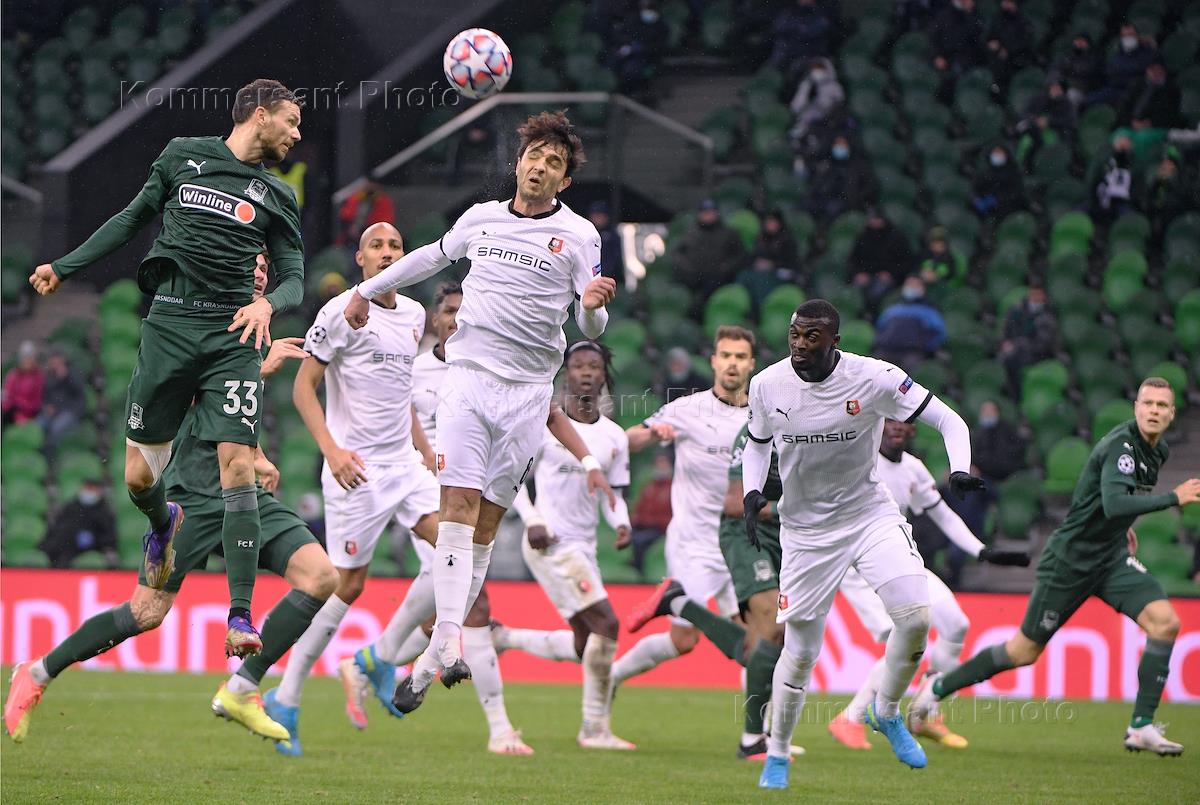 Лига чемпионов УЕФА. Матч по футболу между командами "Краснодар" (Краснодар, Россия) - "Ренн" (Ренн, Франция) на стадионе "Краснодар". Игрок команды "Краснодар" Маркус Берг (в центре) и вратарь команды "Ренн" Ромен Сален (справа) во время матча.