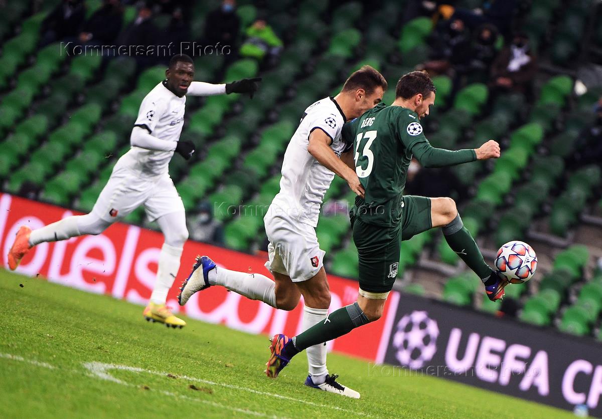 Лига чемпионов УЕФА. Матч по футболу между командами "Краснодар" (Краснодар, Россия) - "Ренн" (Ренн, Франция) на стадионе "Краснодар". Игрок команды "Краснодар" Маркус Берг (слева) во время матча.