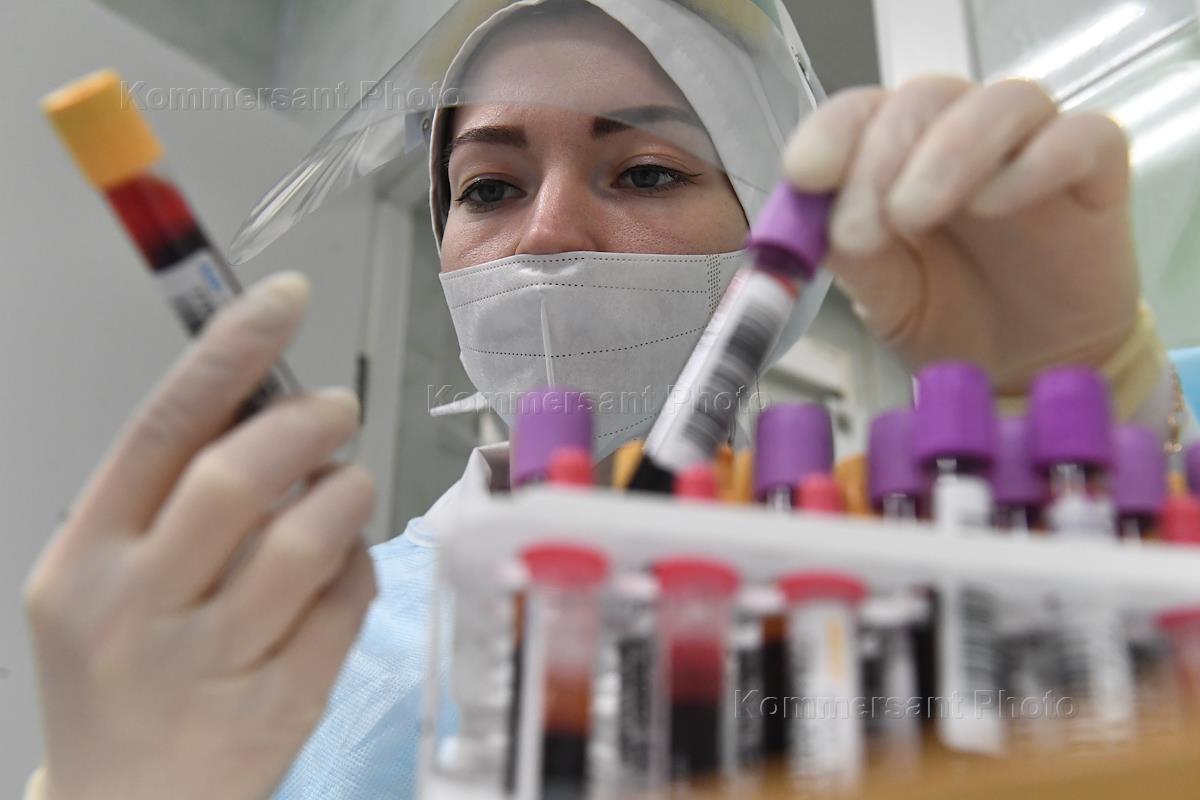 Сдача плазмы пациентами, переболевшими COVID-19, в городской клинической больнице №52. Медицинский работник в защитном костюме с пробирками плазмы, собранной у доноров.