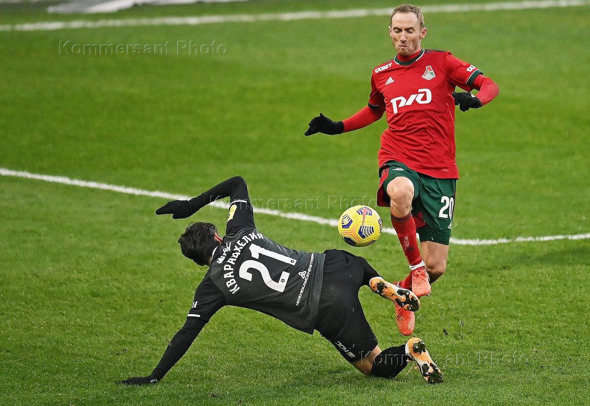Российская Премьер-Лига (РПЛ). Тинькофф - Чемпионат России по футболу 2020/2021. 17-й тур. Матч между командами "Локомотив" (Москва) - "Рубин" (Казань) на стадионе "РЖД Арена". Игрок команды "Рубин" Хвича Кварацхелия (слева) и игрок команды "Локомотив" Владислав Игнатьев (справа) во время матча.