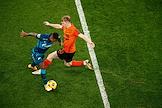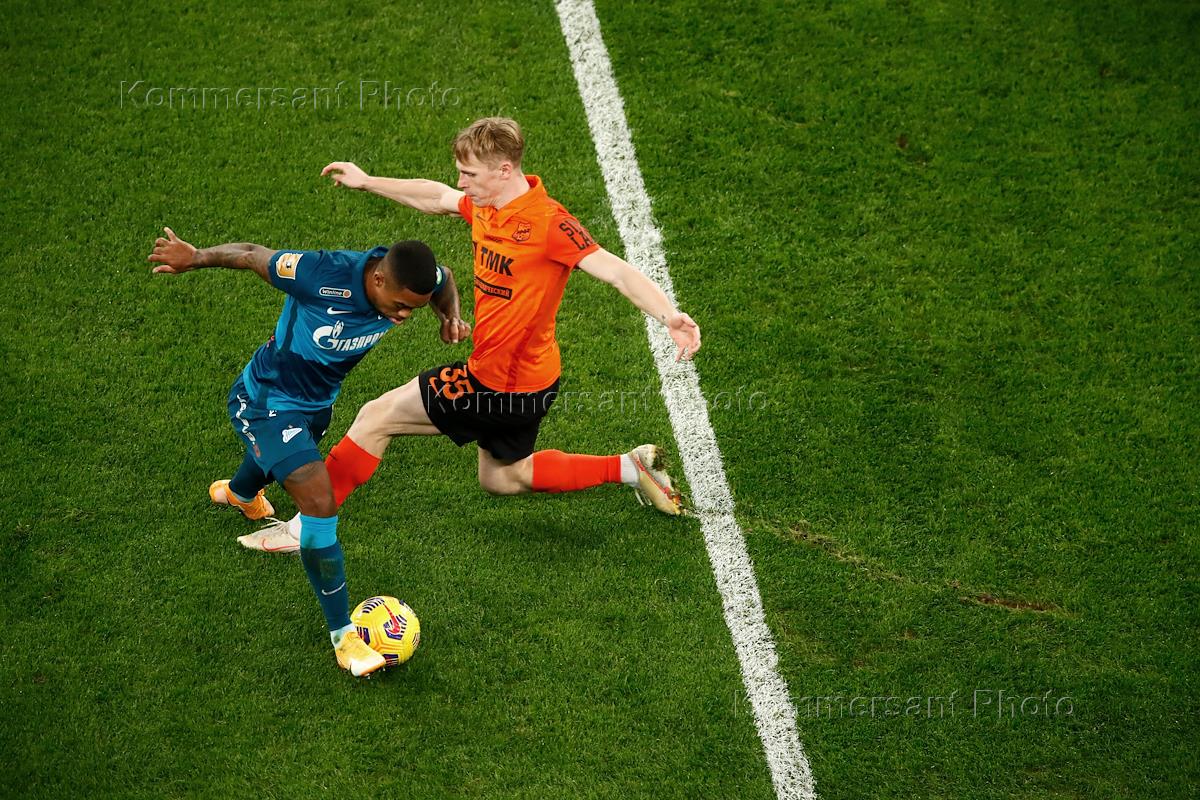 Российская Премьер-Лига (РПЛ). Тинькофф - Чемпионат России по футболу 2020/2021. 17-й тур. Матч между командами "Зенит" (Санкт-Петербург) — "Урал" (Екатеринбург) на стадионе "Газпром Арена". Игрок команды "Зенит" Малком (слева) и игрок команды "Урал" Николай Золотов (справа) во время матча.
