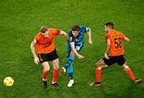 Российская Премьер-Лига (РПЛ). Тинькофф - Чемпионат России по футболу 2020/2021. 17-й тур. Матч между командами "Зенит" (Санкт-Петербург) — "Урал" (Екатеринбург) на стадионе "Газпром Арена". Игрок команды "Зенит" Артем Дзюба (в центре), игроки команды "Урал" Алексей Евсеев (слева) и Эрик Бикфалви (справа) во время матча.