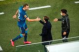Российская Премьер-Лига (РПЛ). Тинькофф - Чемпионат России по футболу 2020/2021. 17-й тур. Матч между командами "Зенит" (Санкт-Петербург) — "Урал" (Екатеринбург) на стадионе "Газпром Арена". Игрок команды "Зенит" Артем Дзюба (слева) и главный тренер команды "Зенит" Сергей Семак (в центре) во время матча.