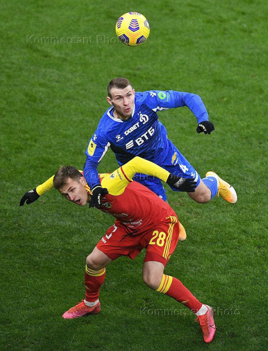 Российская Премьер-Лига (РПЛ). Тинькофф - Чемпионат России по футболу 2020/2021. 17-й тур. Матч между командами "Динамо" (Москва) - "Арсенал" (Тула) на стадионе "ВТБ Арена". Игрок команды "Динамо" Даниил Весовой (справа) и игрок команды "Арсенал" Сергей Ткачев (слева) во время матча.