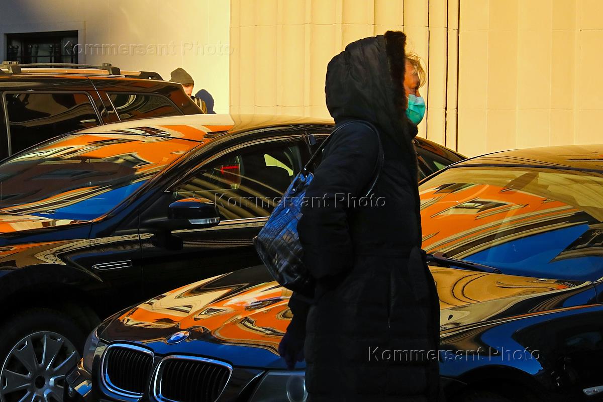 Виды Москвы. Жанровая фотография. Прохожие в медицинских масках на Смоленской площади.