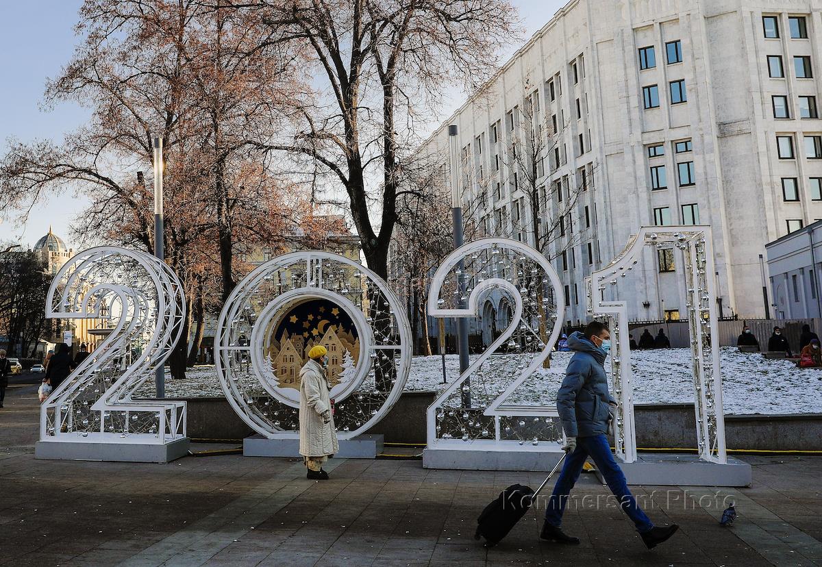 Виды Москвы. Новогоднее убранство города. Жанровая фотография. Прохожие в медицинских масках на улице Воздвиженке.