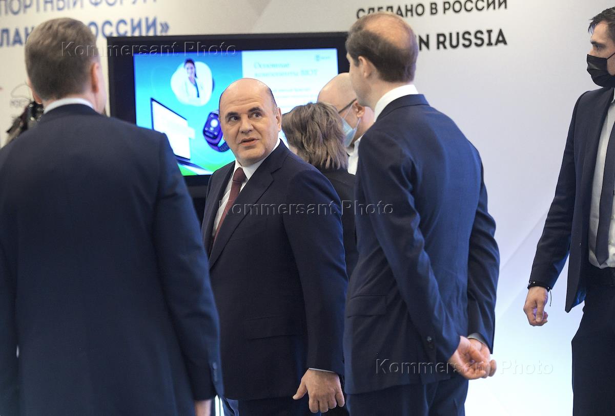 Международный экспортный форум "Сделано в России - 2020" прошел в Международном мультимедийном пресс-центре МИА "Россия сегодня". Председатель Правительства России Михаил Мишустин (второй слева) иминистр промышленности и торговли России Денис Мантуров (второй справа) во время осмотра выставки в рамках экспортного форума, на которой представлены высокотехнологичные товары и услуги российских экспортеров в сфере медицины, информационных технологий и промышленности.