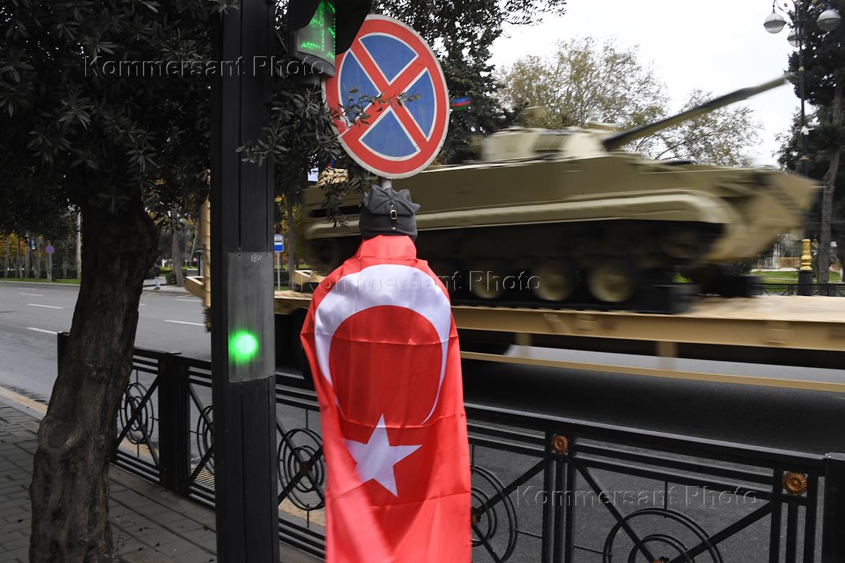 Азербайджан после завершения военного конфликта вокруг Нагорного Карабаха. Репетиция военного парада, посвященного окончанию конфликта в Нагорном Карабахе. Провоз трофейной военной техники, захваченной в результате конфликта.