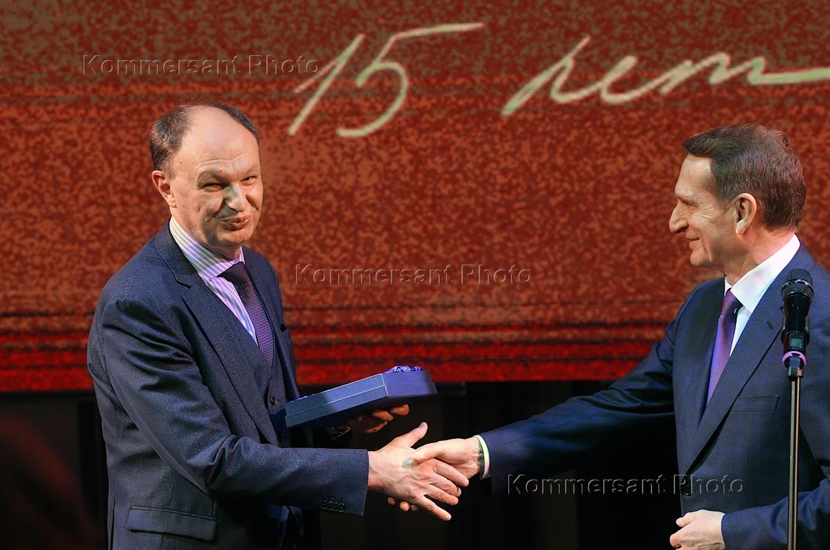 The Big Book National Literary Prize ceremony at the Stanislavsky Electrotheatre. Head of the Federal Agency for Press and Mass Communications Mikhail Seslavinsky (left) and Director of the Russian Foreign Intelligence Service Sergei Naryshkin (right) during a ceremony.