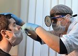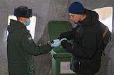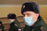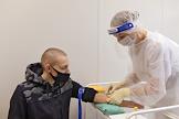 Отправка призывников в научные роты Вооруженных сил России с территории сборного пункта военного комиссариата города Москвы. Жанровая фотография. Медсестра во время взятия анализа крови у призывников на сборном пункте.