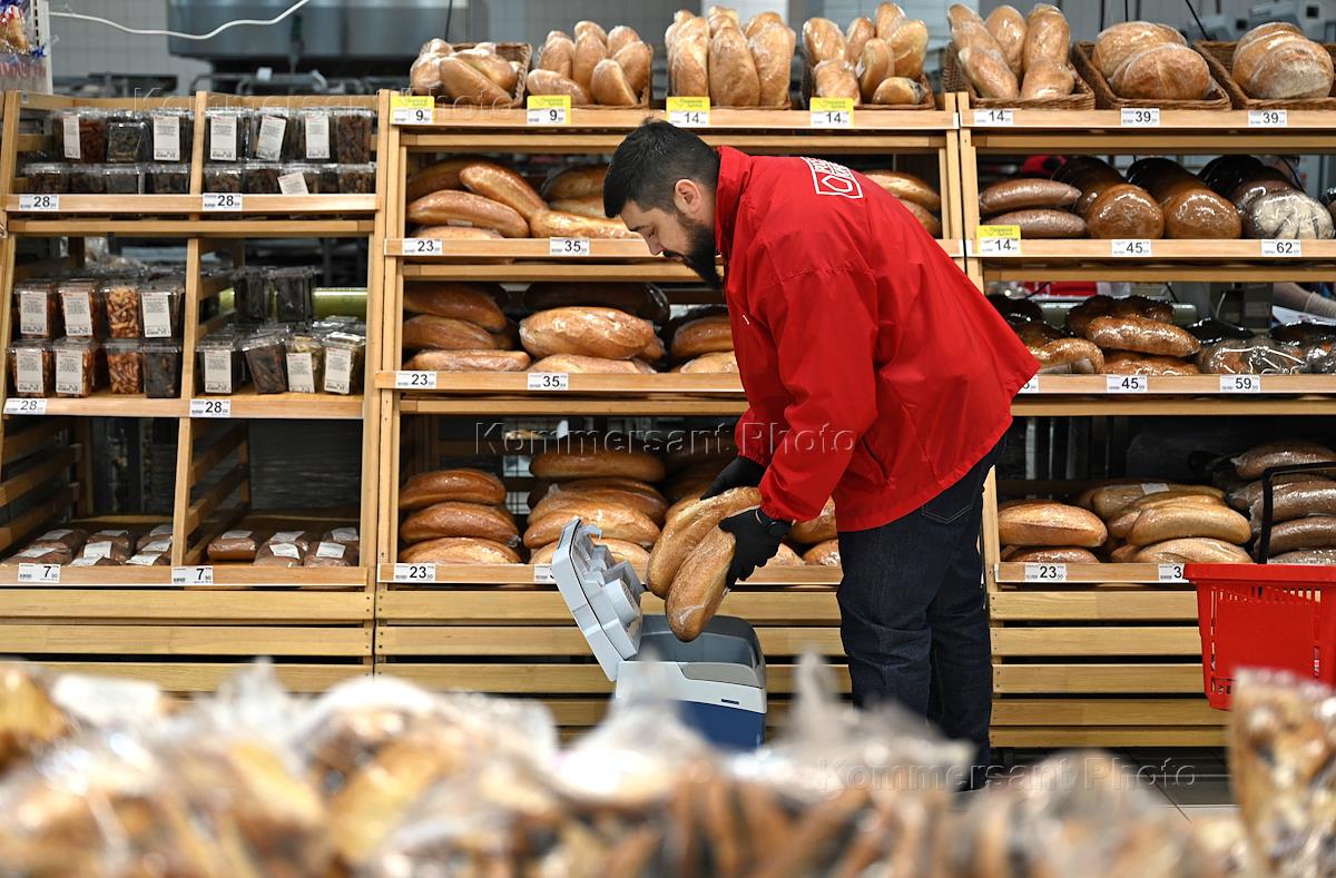 Работа гипермаркета "Ашан". Жанровая фотография. Сотрудник гипермаркета во время раскладки товара в хлебном отделе.